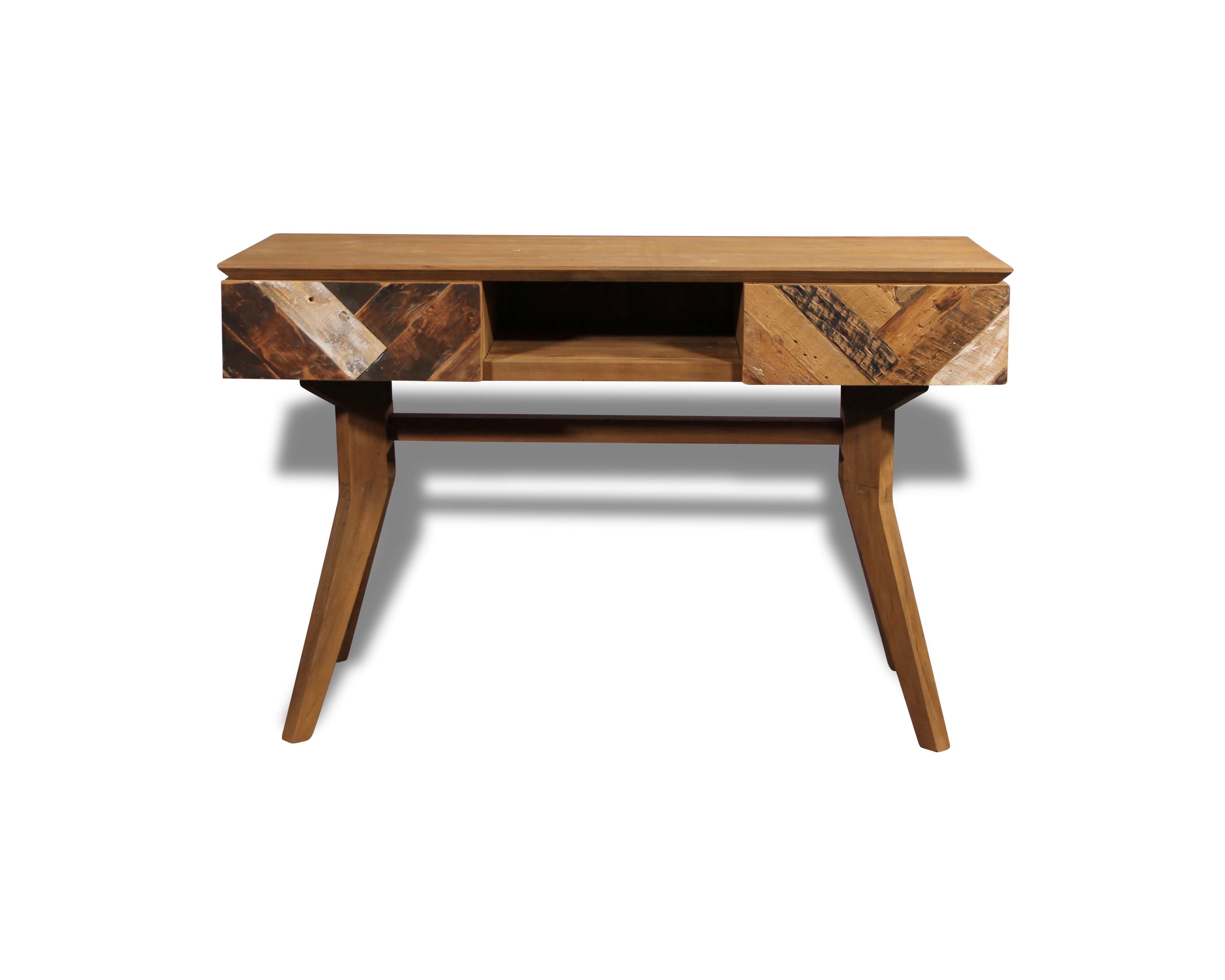 Dieser Schreibtisch oder Konsolentisch aus recyceltem Teakholz verkörpert perfekt die Balance zwischen Vintage-Stil, handwerklichem Touch und moderner Funktionalität. Seine schlanke Oberseite ruht auf einem schrägen, vom skandinavischen Design inspirierten Sockel, der ihm Leichtigkeit und Eleganz verleiht. Die beiden seitlichen Schubladen weisen ein Chevron-Muster aus mehrfarbigem Recyclingholz auf, was dem Stück eine echte Einzigartigkeit verleiht. Der offene Mittelraum eignet sich ideal zur Aufbewahrung von Dokumenten, einem Laptop oder dekorativen Accessoires. Kompakt und praktisch passt dieses Möbelstück gleichermaßen gut in eine Eingangshalle, ein Wohnzimmer oder einen Bürobereich. Seine robuste Bauweise und das natürliche Holz bieten eine vorbildliche Haltbarkeit. Dank der unterschiedlichen Farben und Strukturen des verwendeten Recyclingholzes ist jedes Stück ein Unikat. Ob zum Arbeiten oder zur Verschönerung einer Wand, diese Konsole mit ihrem umweltfreundlichen Design verleiht Ihrem Interieur Charakter. Eine perfekte Wahl für eine Einrichtung, die sowohl natürlich als auch originell ist.