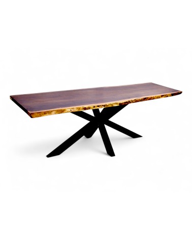 Der Tisch „Panerea” aus Suarholz behält die natürliche Form des Baumstamms bei und schafft so eine einzigartige Oberfläche mit unregelmässigen, organischen Kanten. Dieser 213 cm lange Tisch aus massivem Suarholz aus einem Stück verkörpert die perfekte Balance zwischen natürlicher Authentizität und zeitgenössischem Design. Die Tischplatte bringt die warmen Farbtöne des Holzes zur Geltung, die von hellbraun bis tiefbraun reichen und durch einzigartige Maserungen mit eleganten Arabesken unterstrichen werden. Einlagen aus schwarzem Harz füllen die natürlichen Risse und betonen sie, wodurch ein subtiler Kontrast entsteht, der die Einzigartigkeit des Tisches unterstreicht. Die unregelmässigen Kanten wurden beibehalten, um den rohen und organischen Charme des Baumes zu bewahren. Die glatte und sorgfältig bearbeitete Oberfläche garantiert Komfort und außergewöhnliche Langlebigkeit. Der robuste und moderne Mittelfuss aus Metall sorgt für perfekte Stabilität und verleiht dem Tisch einen schlichten, zeitgemäßen Touch. Dank seiner grosszügigen Abmessungen bietet dieser Tisch Platz für viele Gäste in einer geselligen Atmosphäre. Als echtes Meisterstück vereint er die Kraft von Massivholz mit der Finesse hochwertiger Handwerkskunst.