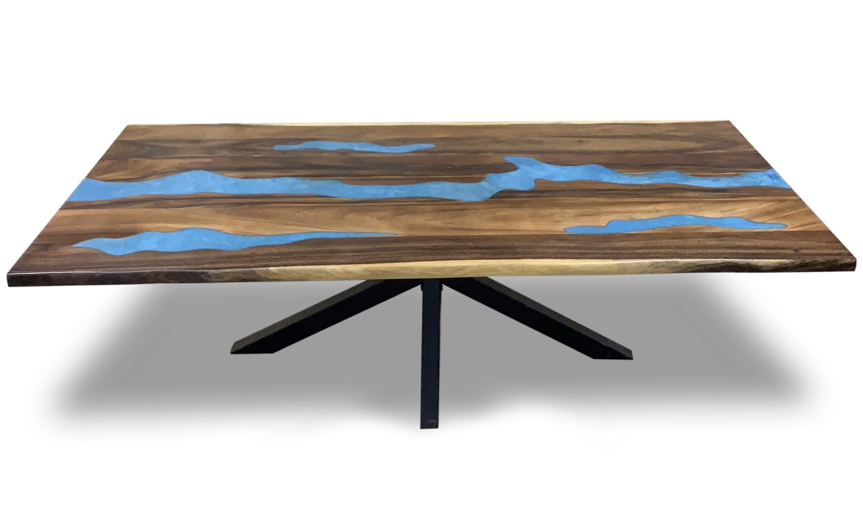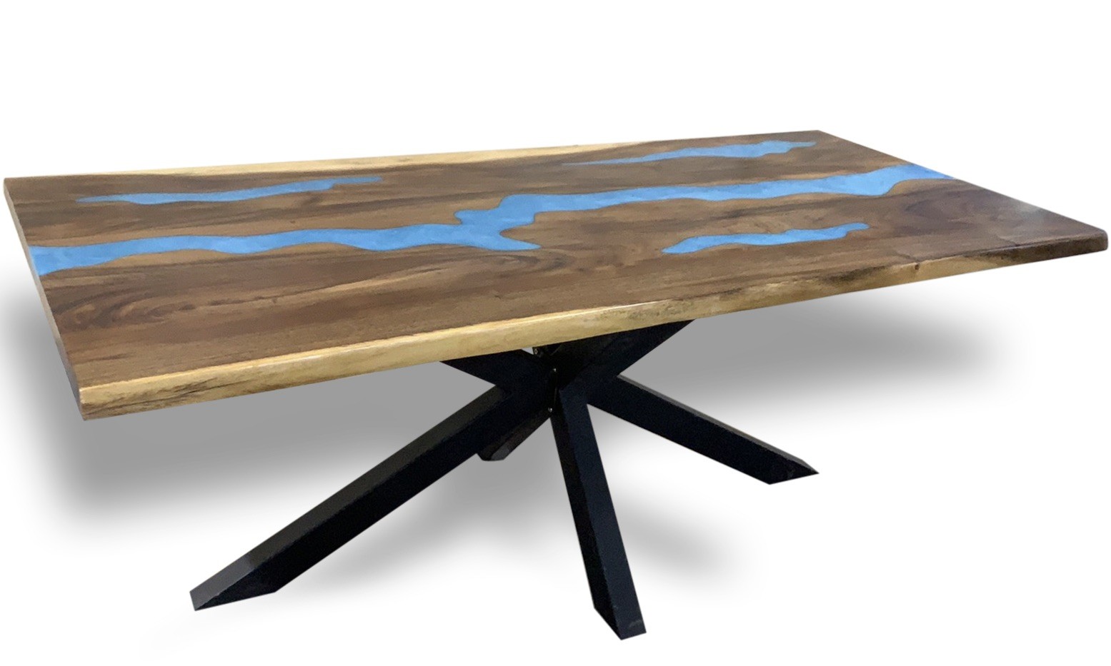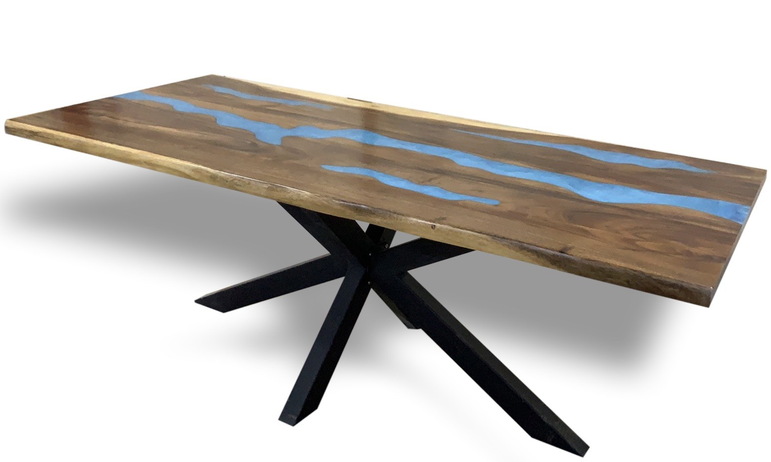 Der Blue Epoxy Esstisch bietet Platz für 8 Personen und ist ein sehr einzigartiges Stück.