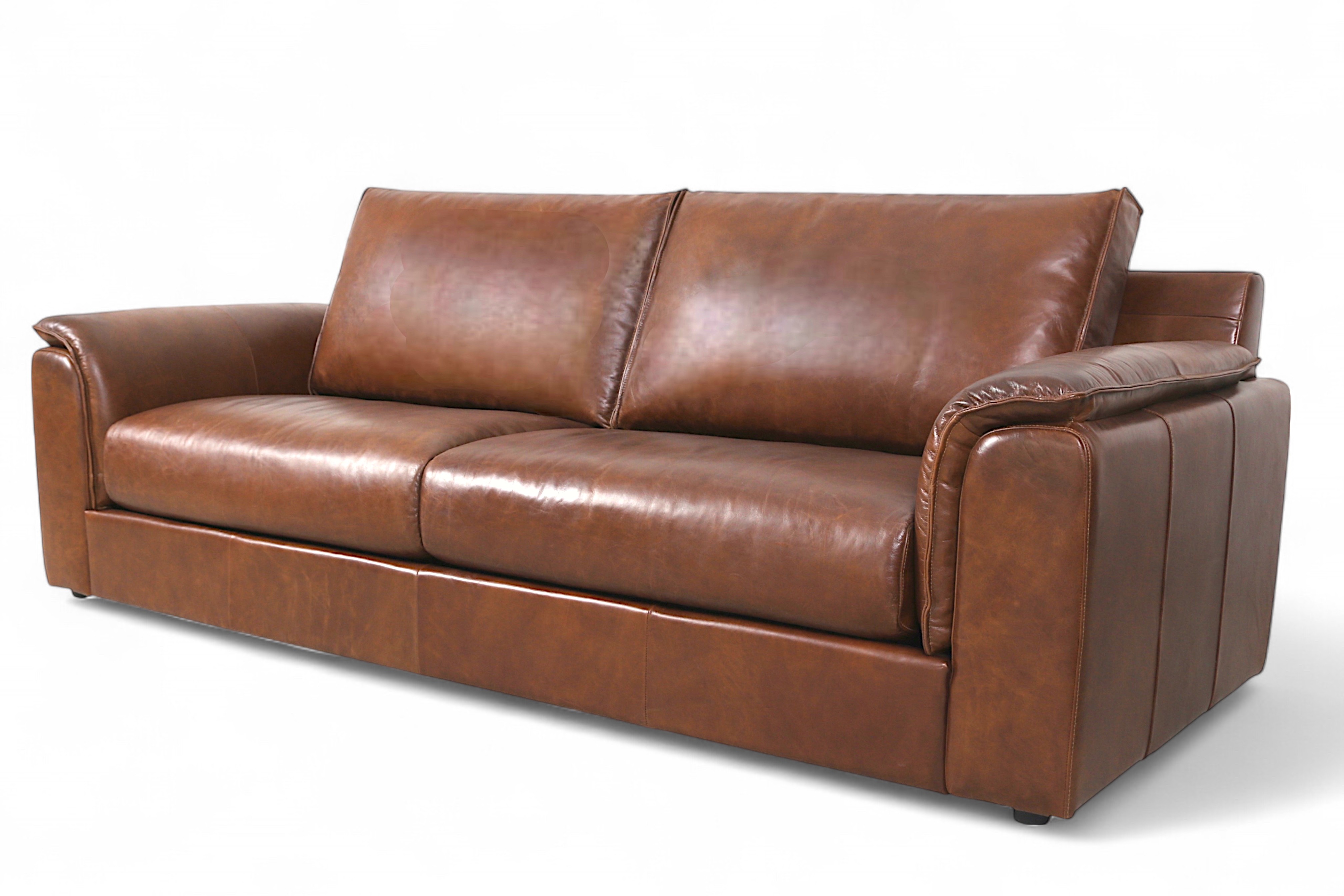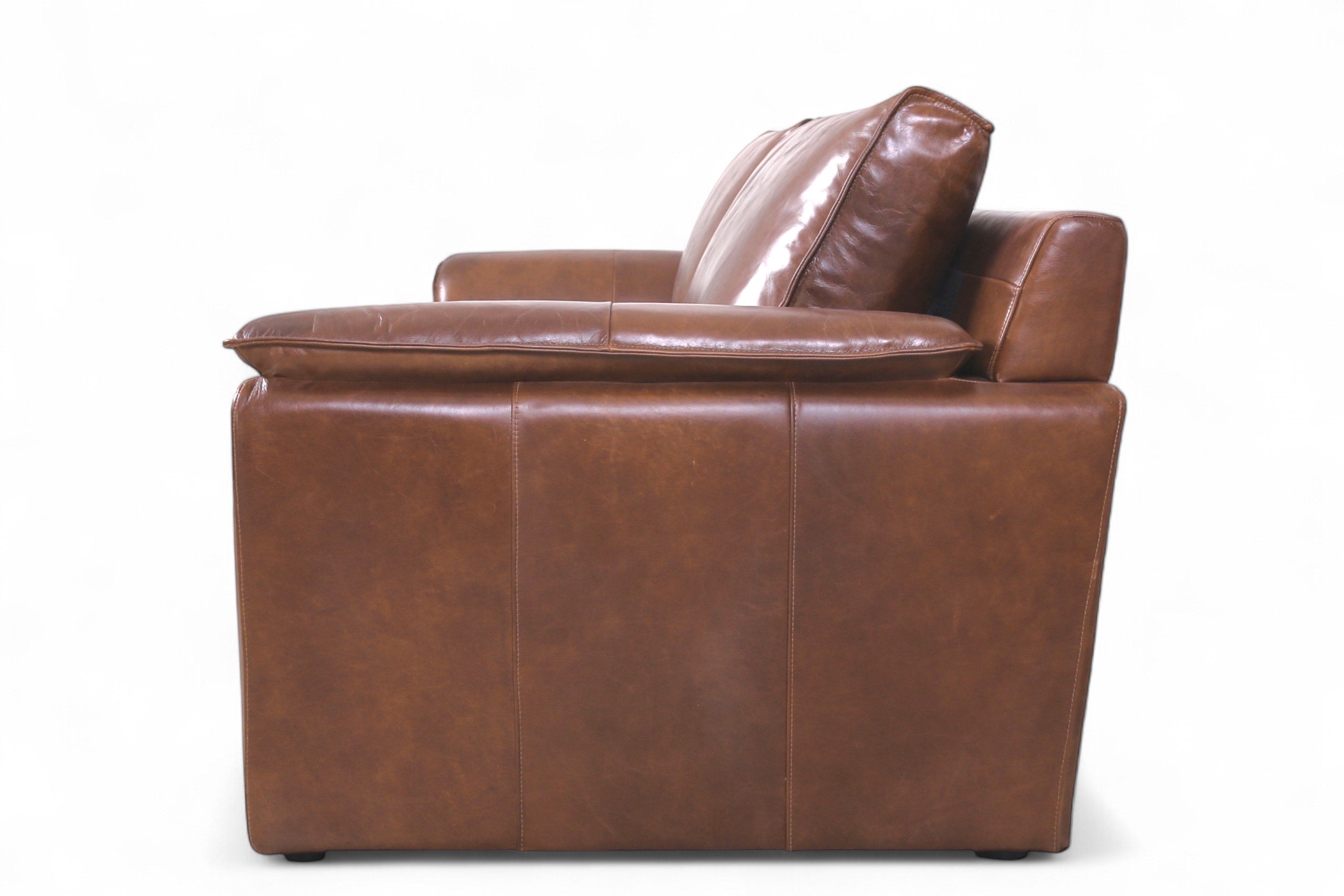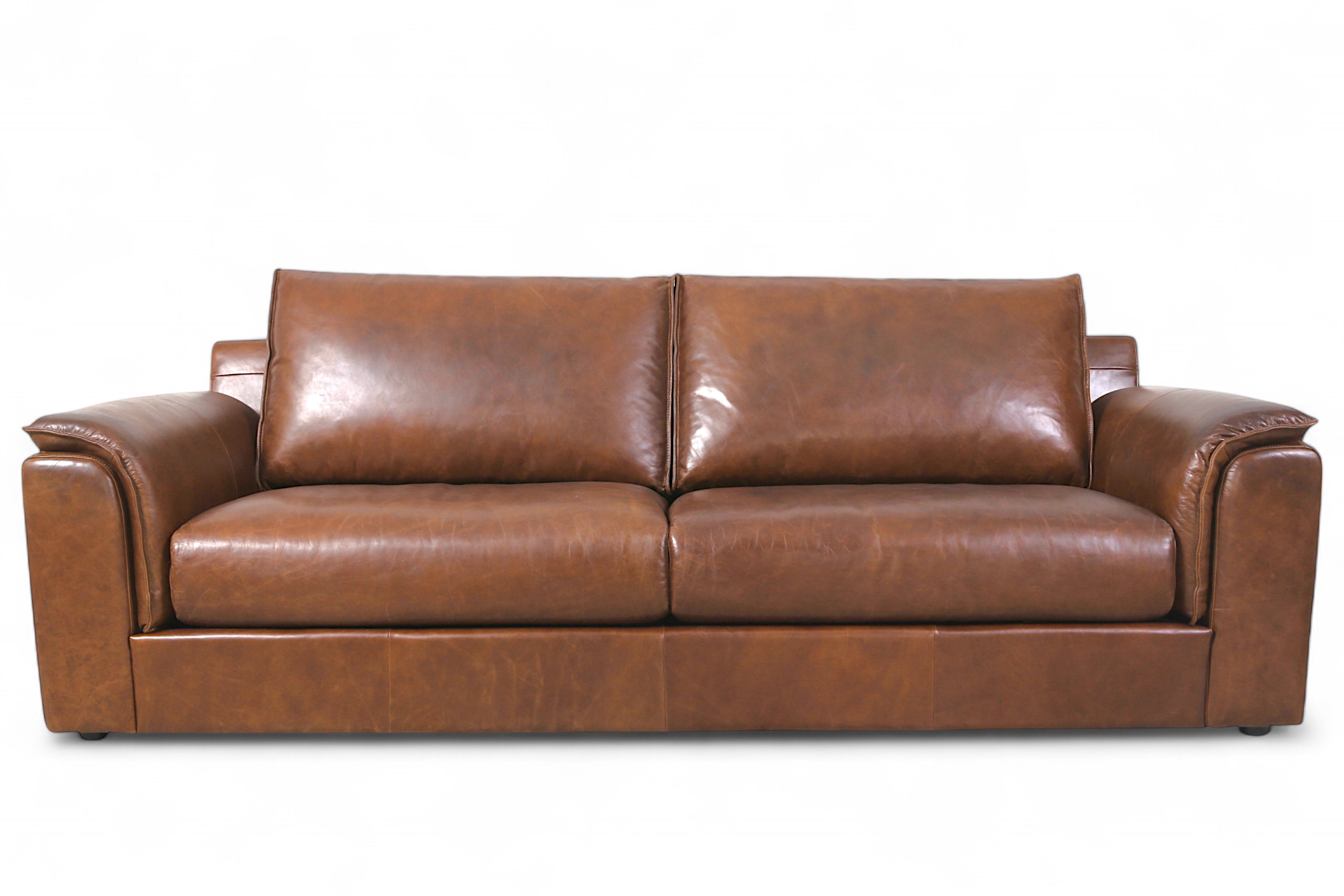 Dieses 3-Sitzer Sofa vereint modernes Design mit hochwertigen Materialien für optimalen Komfort. Es ist mit vollnarbigem argentinischem Rindsleder bezogen, das für seine Geschmeidigkeit und Strapazierfähigkeit geschätzt wird. Die grosszügig gepolsterten Sitz- und Rückenkissen bieten weichen Komfort und laden zum Entspannen ein. Die breiten, leicht abgerundeten Armlehnen sorgen für zusätzlichen Komfort und unterstreichen den modernen Stil. Das leicht patinierte cognacbraune Leder verleiht Ihrem Zuhause eine warme und elegante Note. Die robuste Konstruktion garantiert höchste Langlebigkeit auch bei täglichem Gebrauch. Die sorgfältige Verarbeitung und die dezenten Nähte unterstreichen die Qualität des vollnarbigen Leders. Dieses Sofa passt perfekt in jedes Wohnzimmer im modernen, industriellen oder klassischen Chic. Es ist der ideale Mittelpunkt zum Entspannen und Bewirten. Sein dezenter und eleganter Look passt zu jedem Einrichtungsstil.