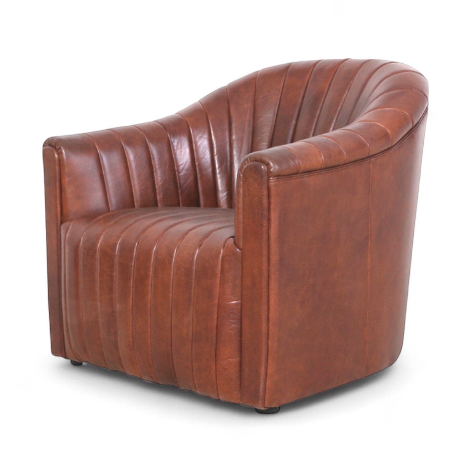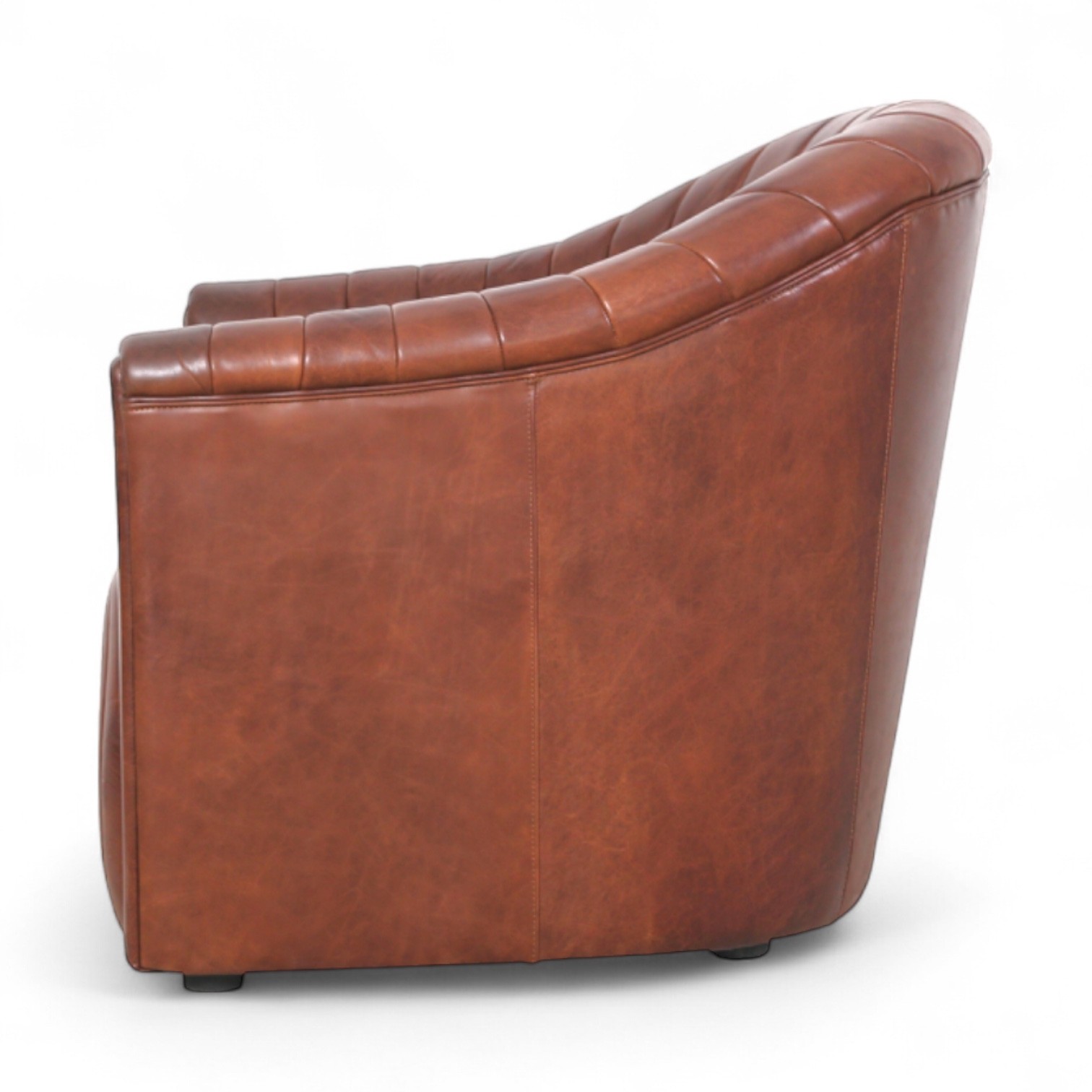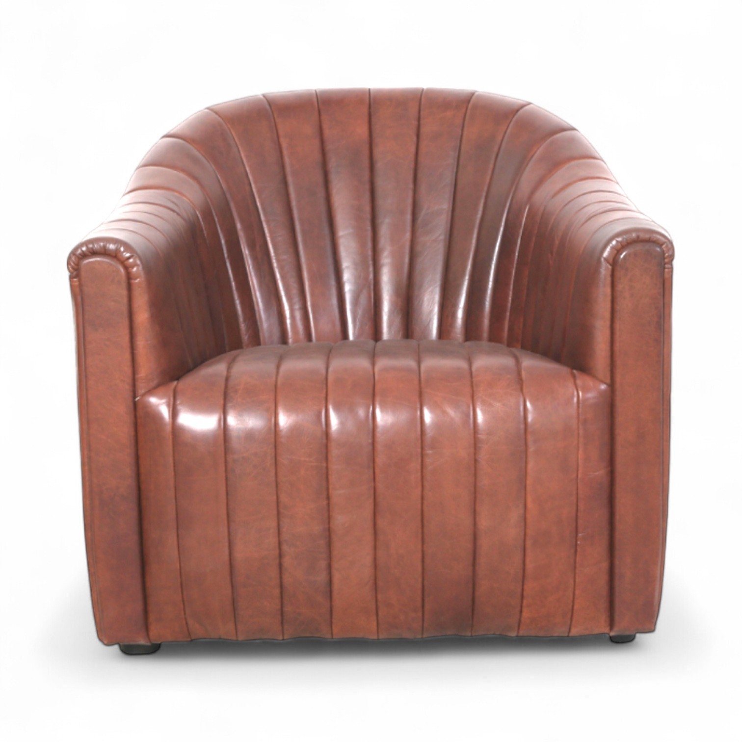 Le fauteuil "Zoe" en cuir pleine fleur de vachette d’Argentine offre un design inspiré des clubs des années 20. Son assise profonde et ses coutures verticales tubulaires assurent un confort optimal et un look vintage chic. Son cuir patiné naturel lui confère une élégance intemporelle, idéale pour tout intérieur raffiné.