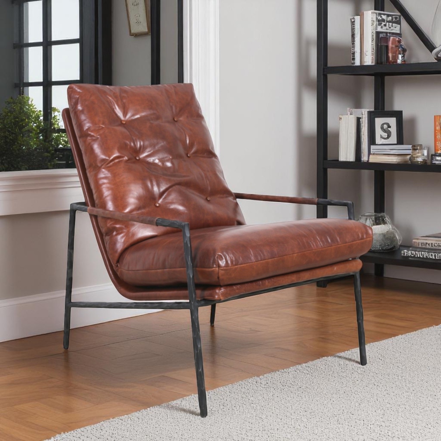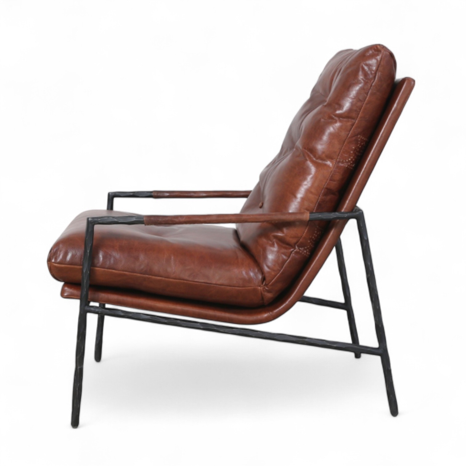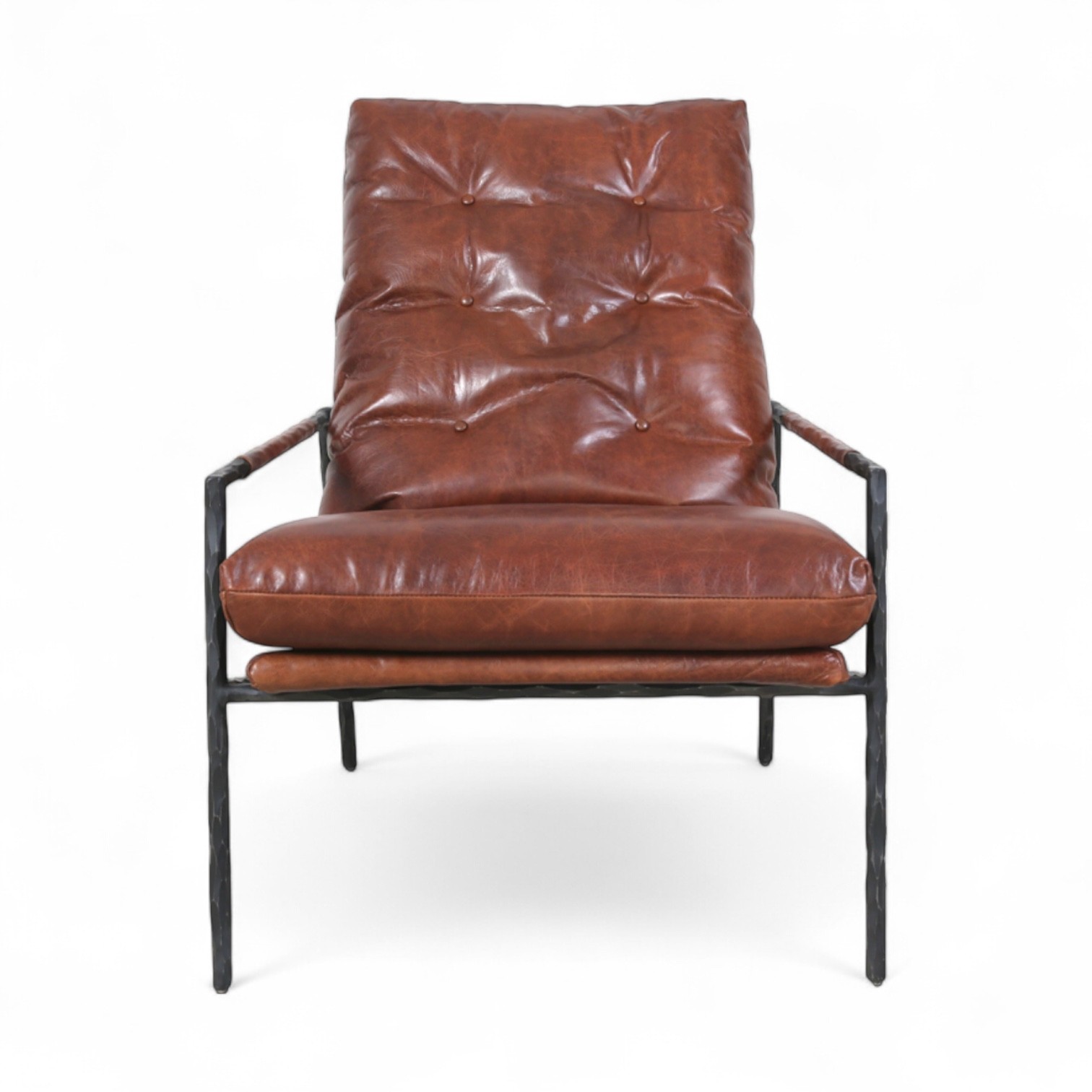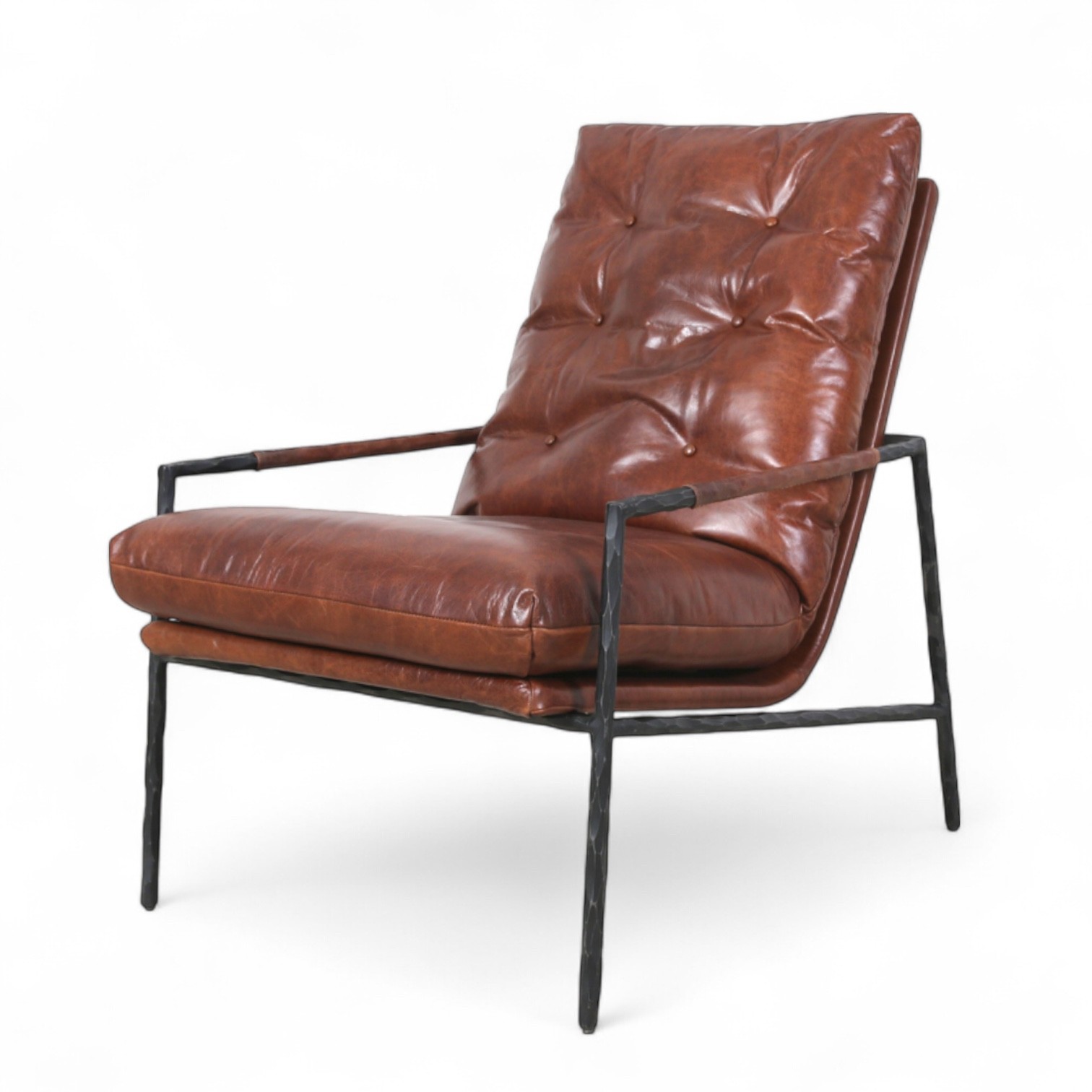 Ce fauteuil associe élégance minimaliste et confort haut de gamme. Il est revêtu de cuir pleine fleur de vachette d’Argentine, reconnu pour sa souplesse et sa durabilité exceptionnelle. Son dossier capitonné avec boutons et son coussin d’assise moelleux invitent à la détente. La structure fine en métal gris anthracite martelé contraste avec la douceur du cuir, créant un design à la fois brut et raffiné. Les accoudoirs partiellement gainés de cuir assurent une prise en main agréable. Son assise basse et inclinée épouse parfaitement la forme du corps pour un confort optimal. Ce fauteuil trouve sa place aussi bien dans un intérieur industriel que contemporain ou vintage. Il est idéal pour un salon, un bureau ou un coin lecture élégant. Le cuir, légèrement patiné, gagne en caractère avec le temps. Chaque pièce est unique grâce aux variations naturelles du cuir pleine fleur.