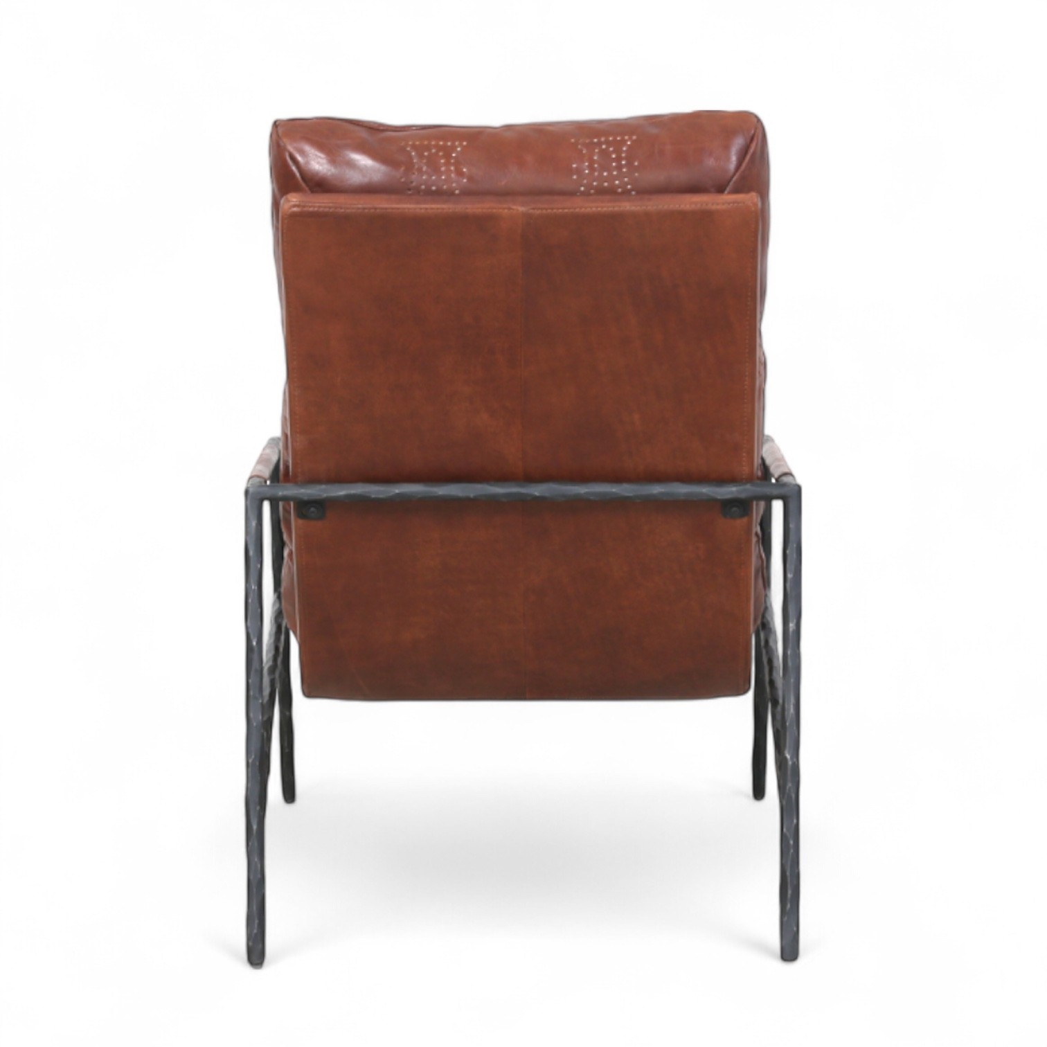 Le fauteuil "Hope" en cuir pleine fleur de vachette d'Argentine associe confort et élégance contemporaine. Son coussin capitonné et son assise moelleuse offrent un confort optimal. La structure fine en métal gris foncé martelé contraste avec le cuir brun cognac, créant un look à la fois brut et raffiné, idéal pour un salon moderne.