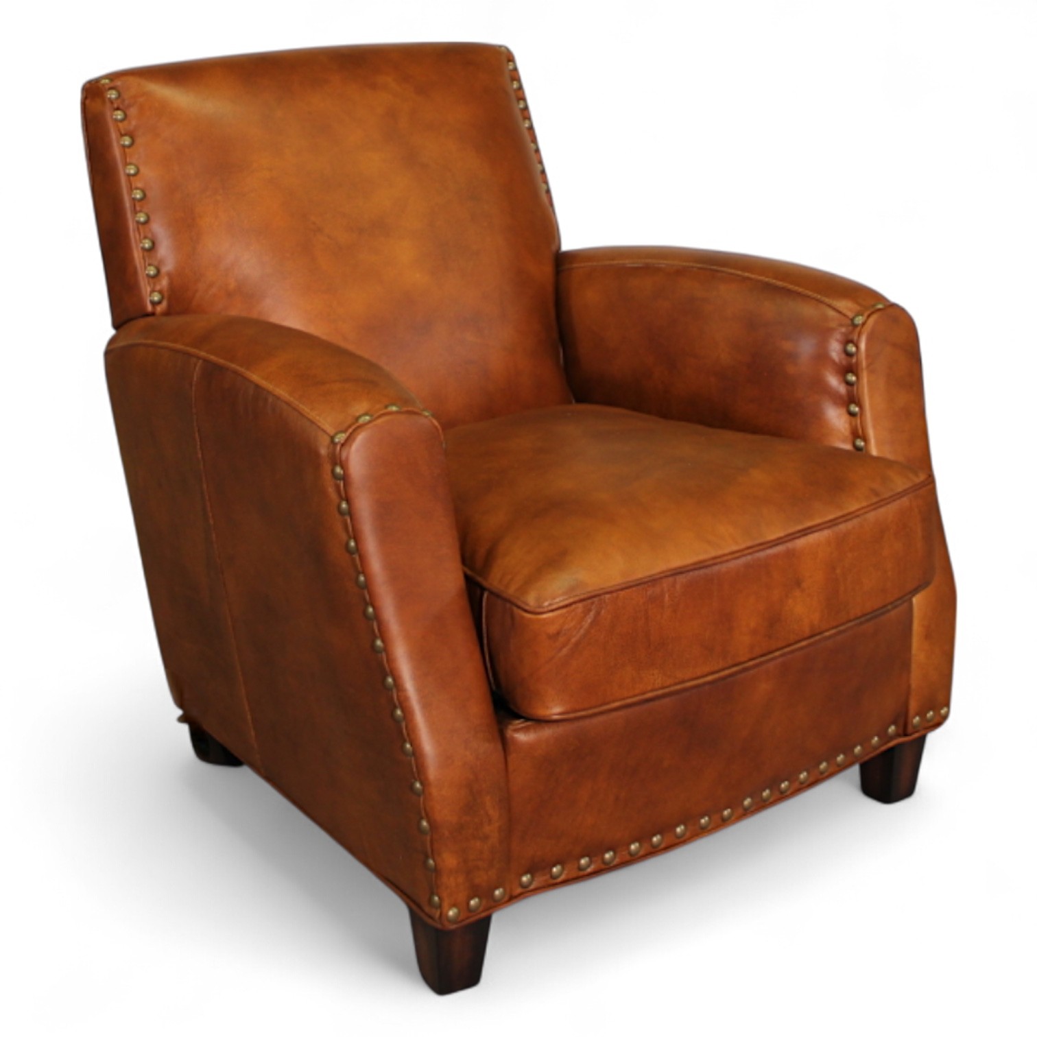 Fauteuil en cuir pleine fleur de vachette d’Argentine alliant élégance et confort. Son cuir naturel, souple et résistant, se patine avec le temps. Assise profonde, dossier incliné et accoudoirs arrondis pour un confort optimal. Finitions soignées avec clous décoratifs et structure en bois massif pour une durabilité exceptionnelle.