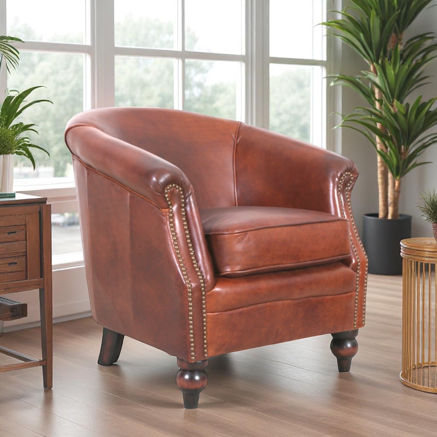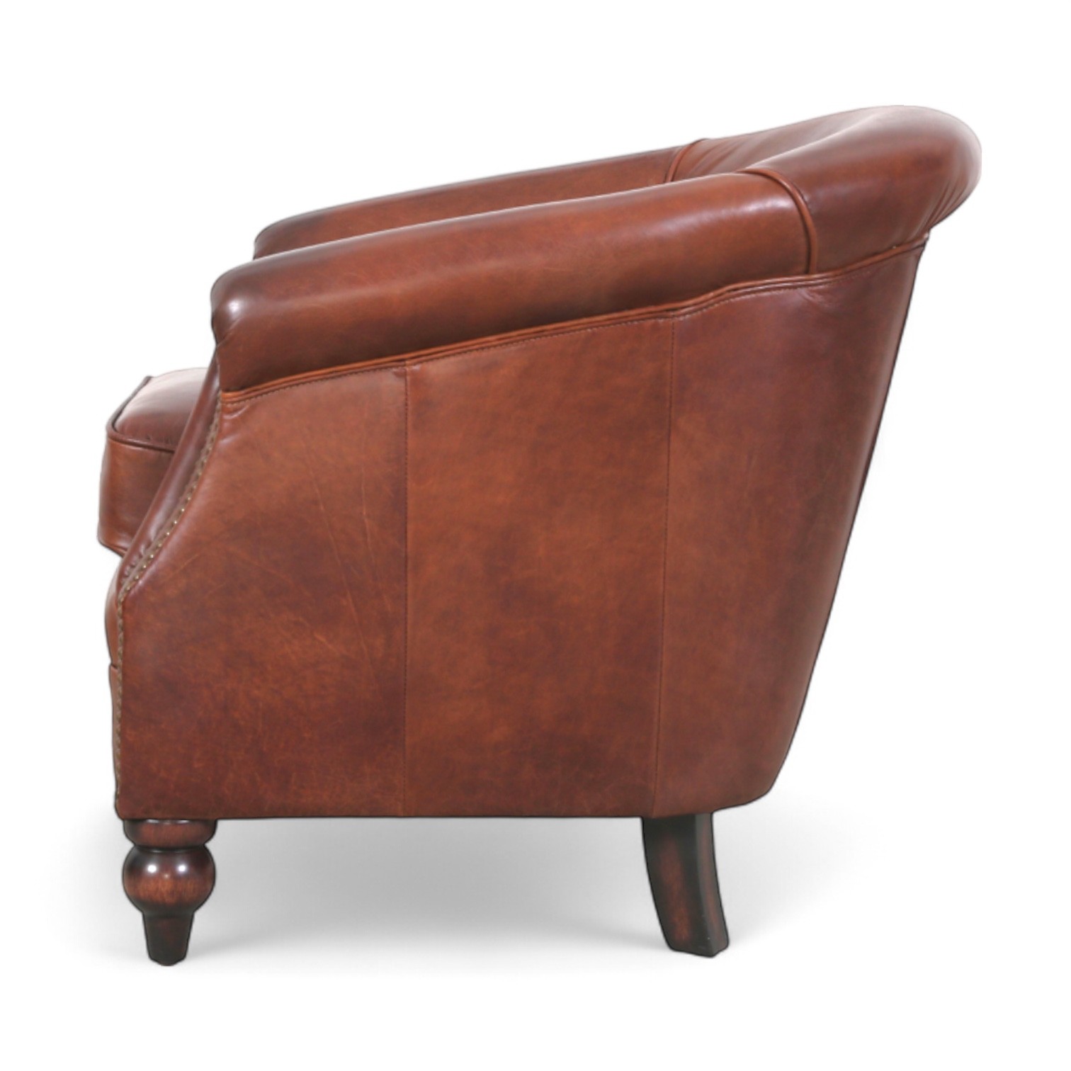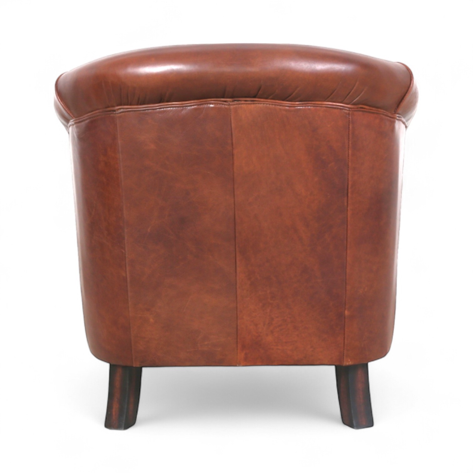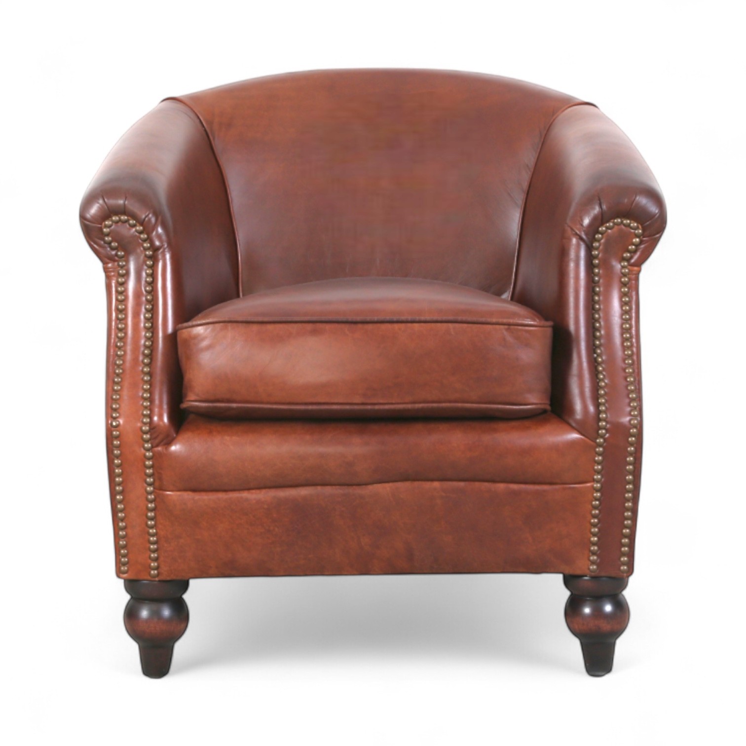 Le fauteuil "Maud", club en cuir pleine fleur de vachette d’Argentine offre un confort moelleux avec son coussin d’assise généreux et ses accoudoirs arrondis. Ses clous tapissiers en laiton et ses pieds tournés en bois massif ajoutent une touche d’élégance classique. Son cuir patiné apporte un charme vintage idéal pour un intérieur raffiné.