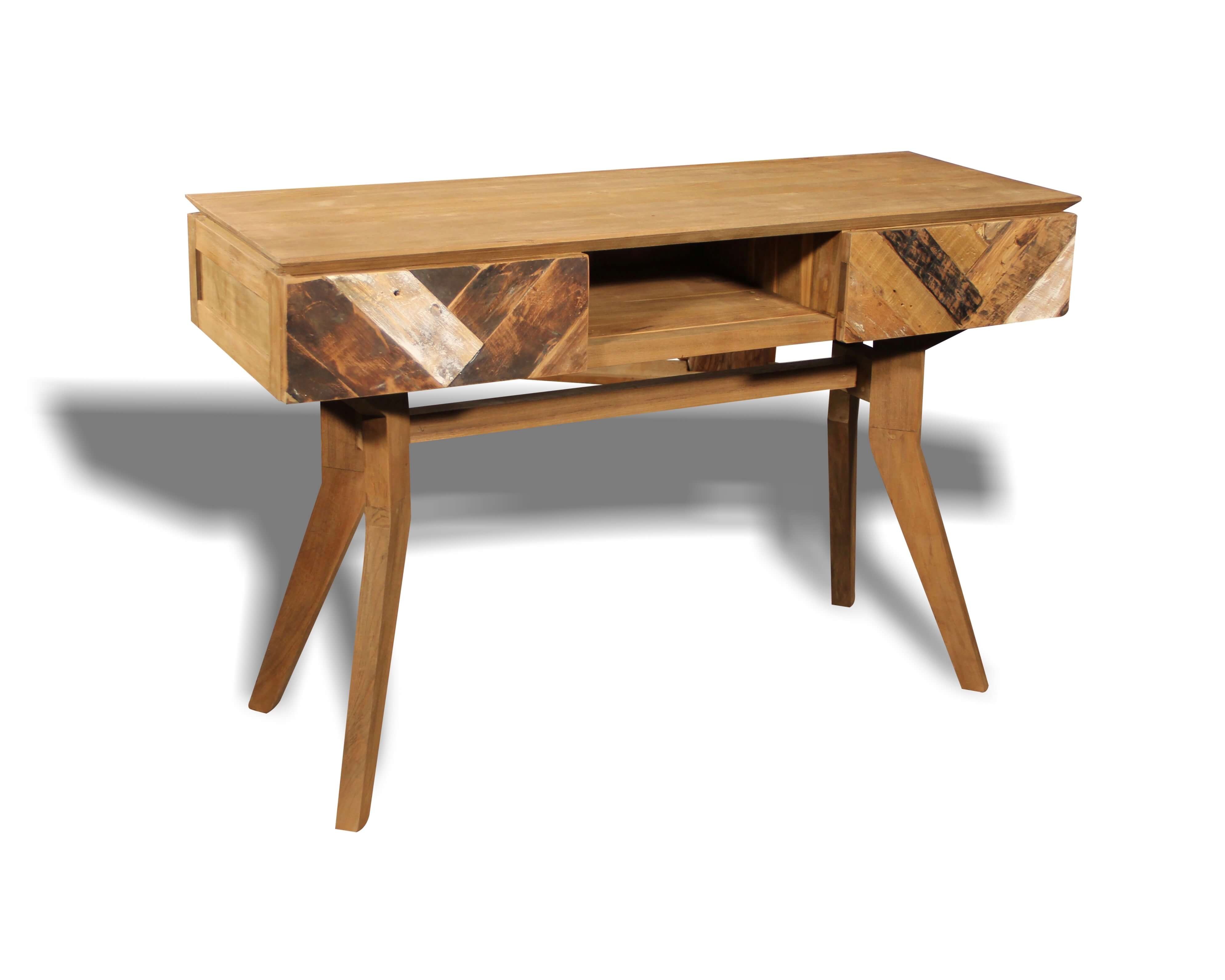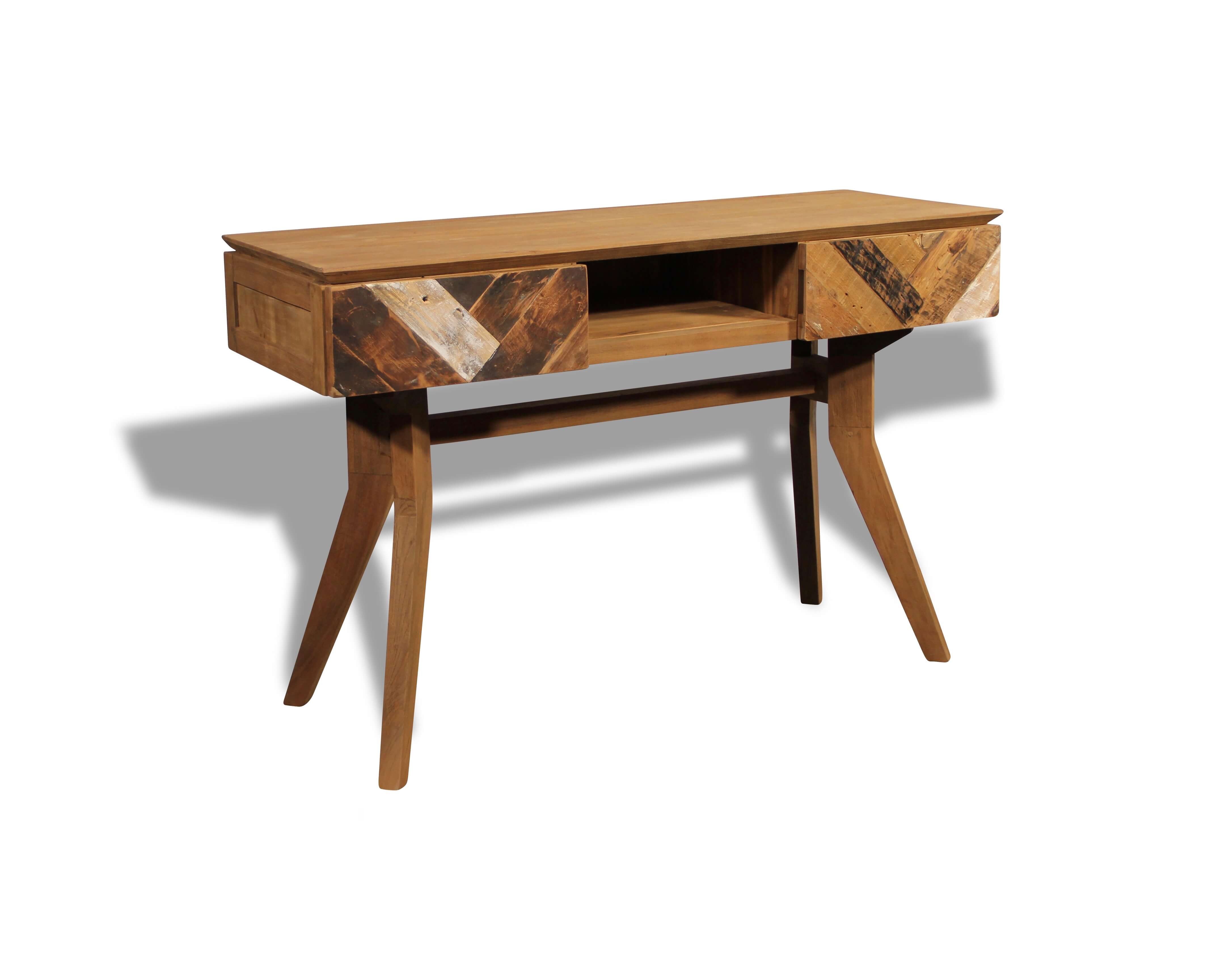 Ce bureau ou console en bois recyclé de teck incarne à merveille l’équilibre entre style vintage, touche artisanale et fonctionnalité contemporaine. Son plateau épuré repose sur un piétement oblique inspiré du design scandinave, qui lui confère légèreté et élégance. Les deux tiroirs latéraux présentent un motif chevron réalisé à partir de bois recyclé multicolore, apportant une véritable singularité à la pièce. L'espace central ouvert est idéal pour glisser documents, ordinateur portable ou accessoires déco. Compact et pratique, ce meuble trouve sa place aussi bien dans une entrée, un salon ou un coin bureau. Sa conception robuste et son bois naturel offrent une durabilité exemplaire. Chaque pièce est unique grâce aux variations de teinte et de texture du bois recyclé utilisé. Que ce soit pour travailler ou pour sublimer un mur, cette console au design éco-responsable ajoutera du cachet à votre intérieur. Un choix parfait pour une déco à la fois naturelle et originale.