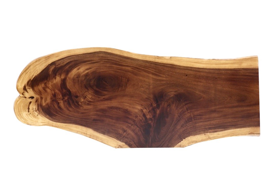 Tiré d'un tronc d'arbre, le plateau en bois de Suar de cette table est taillé en deux pièces afin d'obtenir une structure unique et solide. Les extrémités du plateau sont claires tandis que le reste est d'une teinte sombre veinée particulièrement noble.