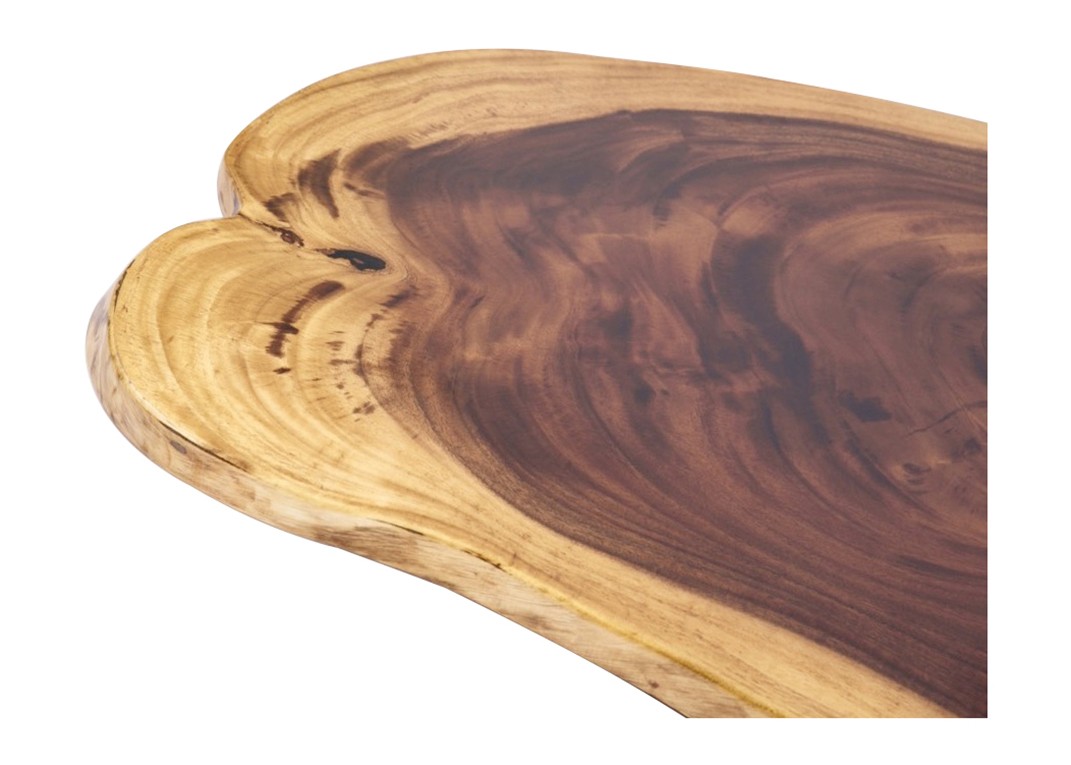 Tiré d'un tronc d'arbre, le plateau en bois de Suar de cette table est taillé en plusieurs parties afin d'obtenir une structure unique et solide. Les couleurs du plateau sont un mélange de tons clairs sombres avec un veinage unique sur chaque pièce.