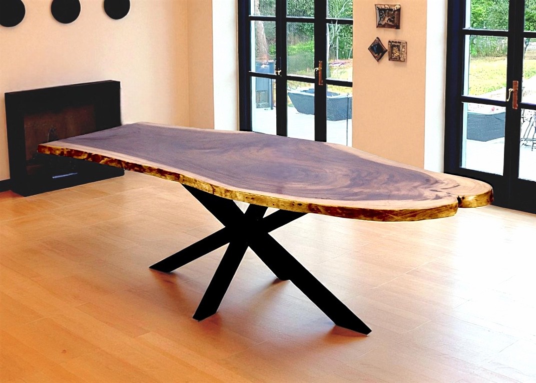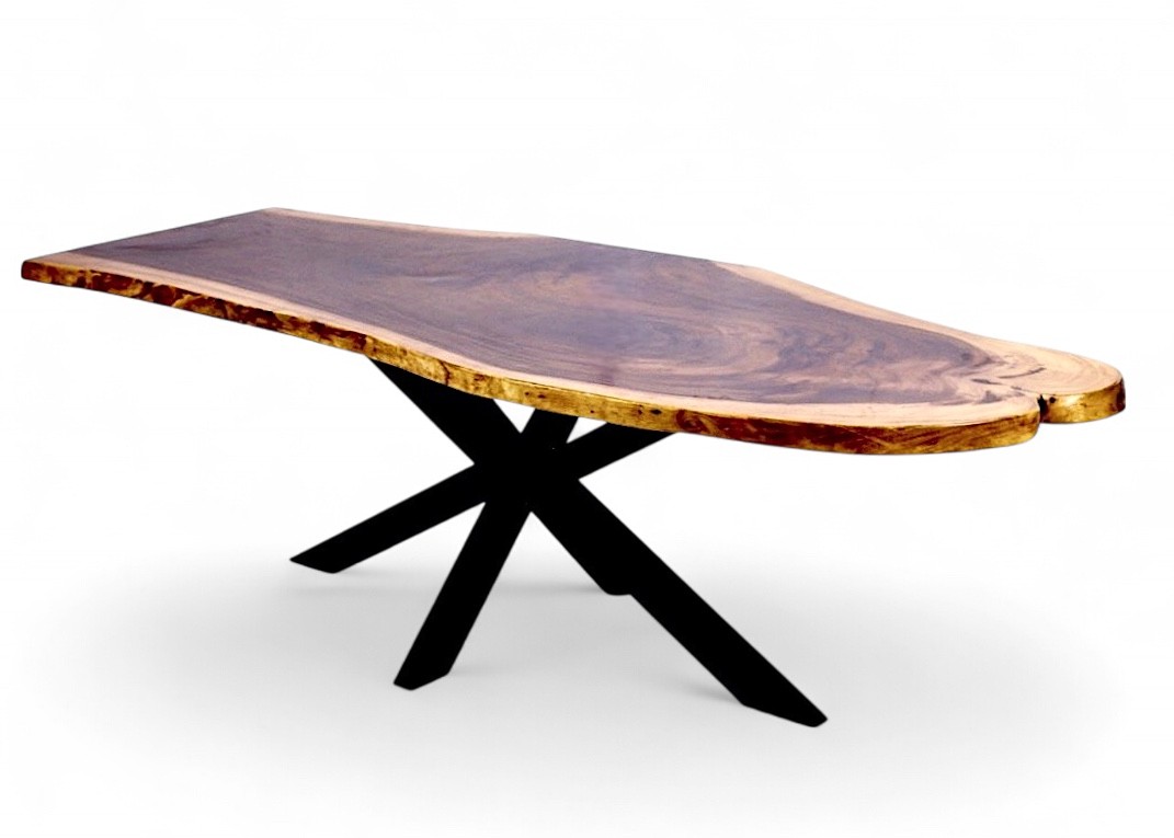 La solidité de cette table est assurée par son plateau épais en bois. Son apparence naturelle lui permet de se marier facilement avec d’autres matières et couleurs. Le veinage du tronc d'arbre ajoute de l'authenticité au style Live Edge de la table à manger "Oeil de Tigre".